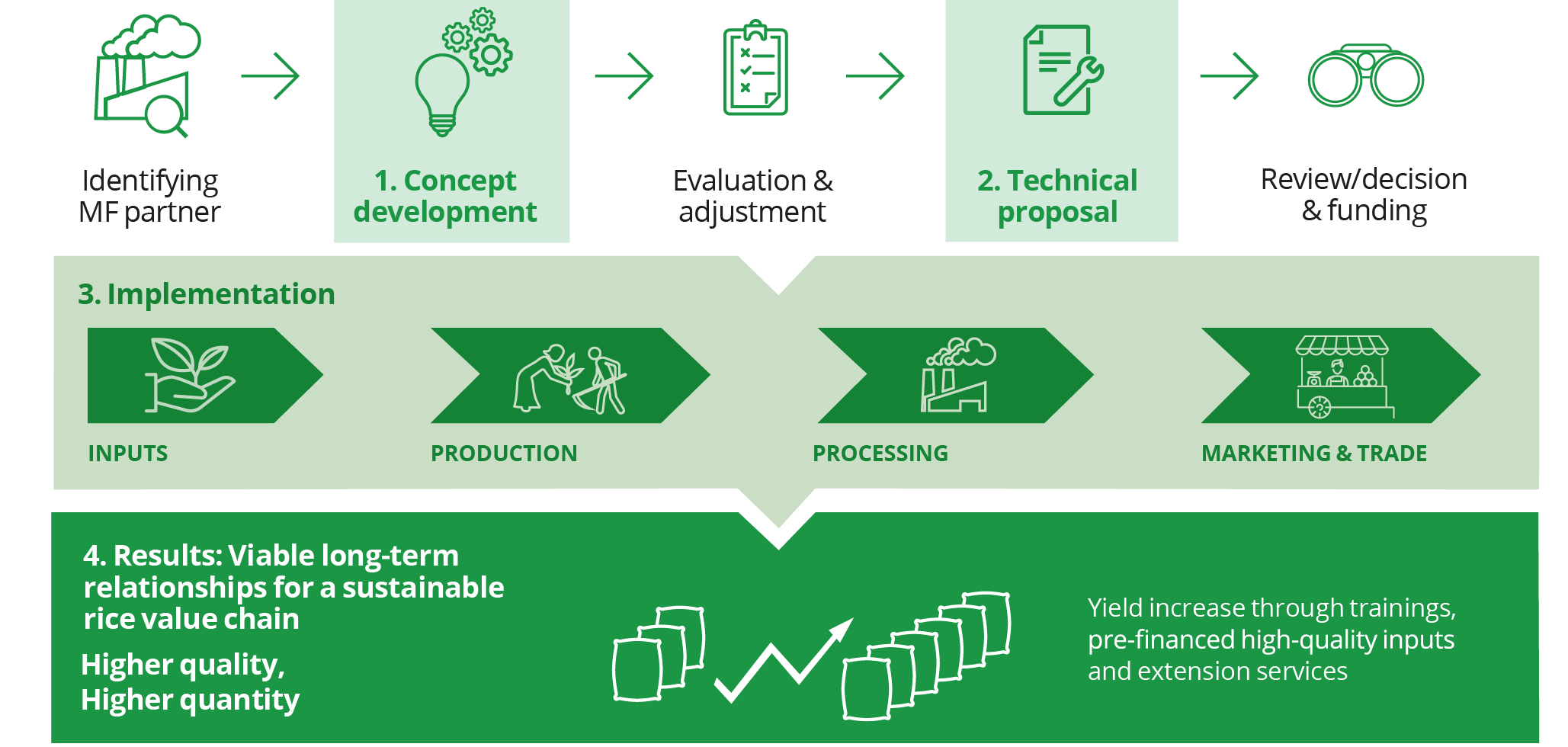 The Matching Fund (MF) is CARI’s most important implementation instrument. It leverages private sector funds to mobilize resources and realize synergies which result in higher impacts and better market linkages. Jointly defined activities such as farmers trainings on the SRP standard, business skills and access to finance are technically supported by CARI but implemented by the MF partners. Through this approach, the sustainability of the project is ensured. The MF partners have ownership of the project as they predominantly fund the activities and bear the responsibility to implement them.